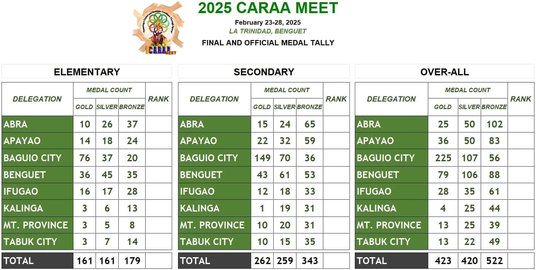 Cordillera Administrative Region Athletic Association (CARAA) Meet stands as the most anticipated regional sporting event for the Cordillera Administrative Region (CAR) in the Philippines. Held annually, this regional meet gathers thousands of student-athletes, coaches, and officials from the region’s six provinces and two cities.
