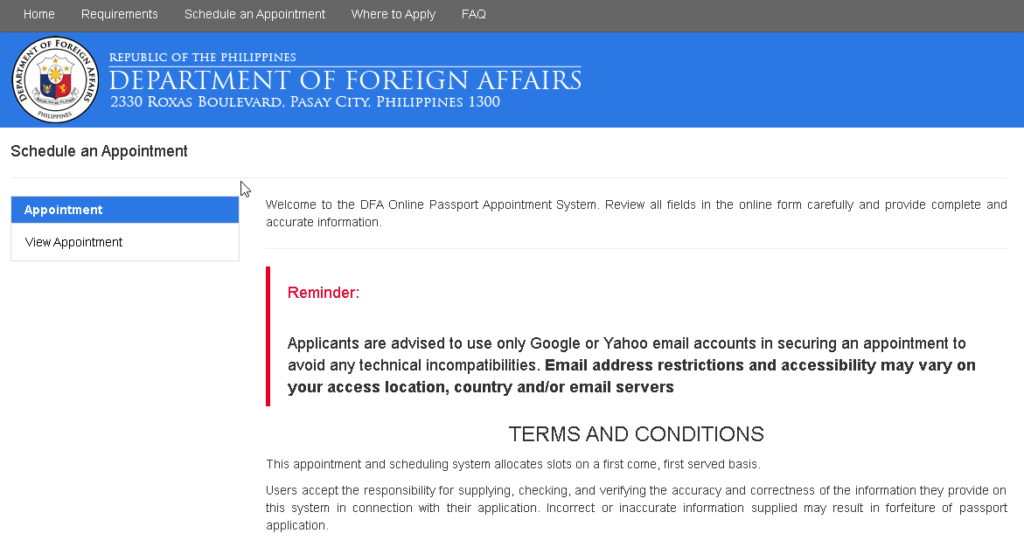 - Visit DFA website at DFA Online Appointment System (passport.gov.ph/appointment) to schedule an appointment. When booking an appointment, ensure that you’ve furnished accurate information for a seamless transaction.