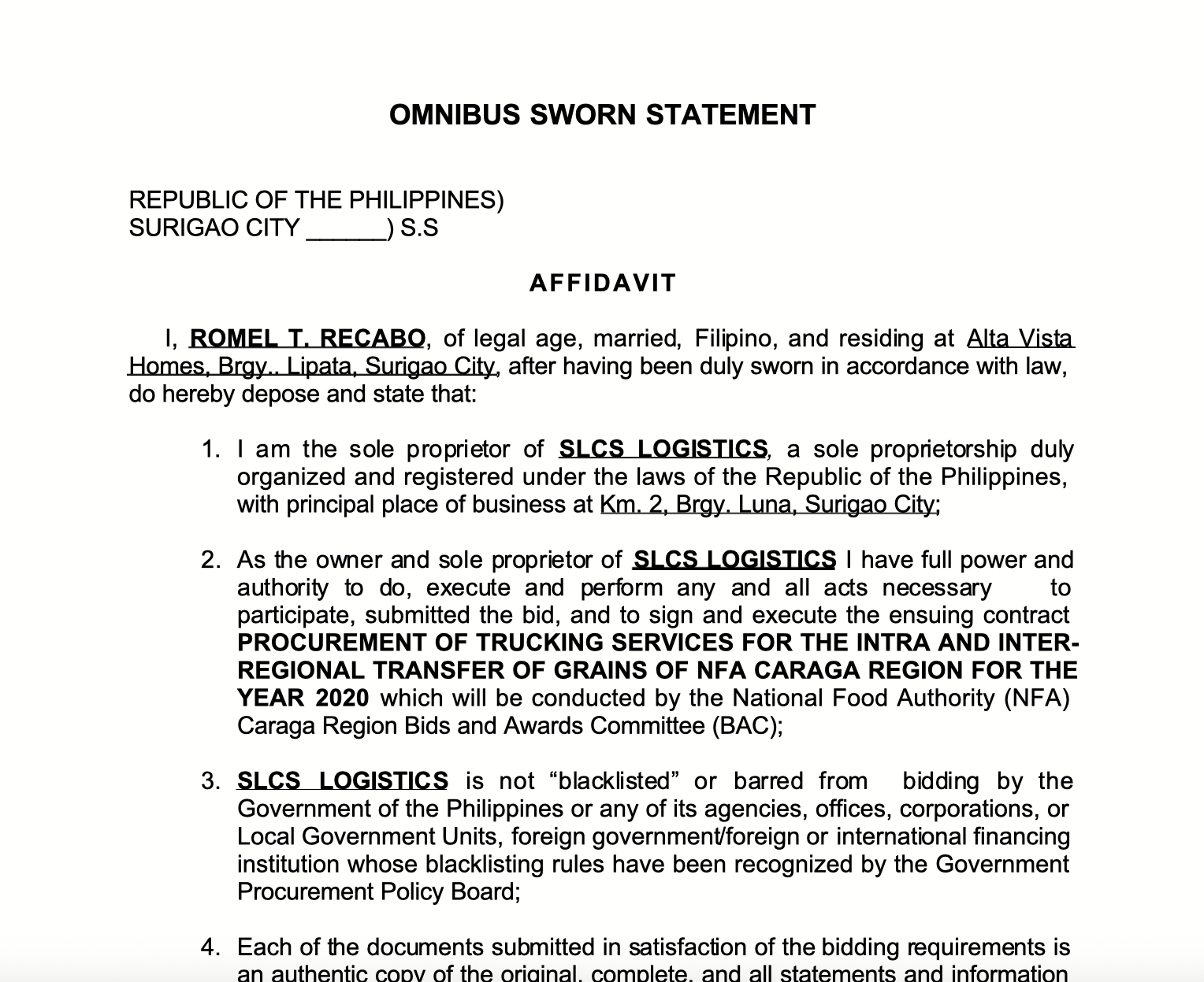 - If a sole proprietorship: I am the sole proprietor or authorized representative of [Name of Bidder] with office address at [address of Bidder];